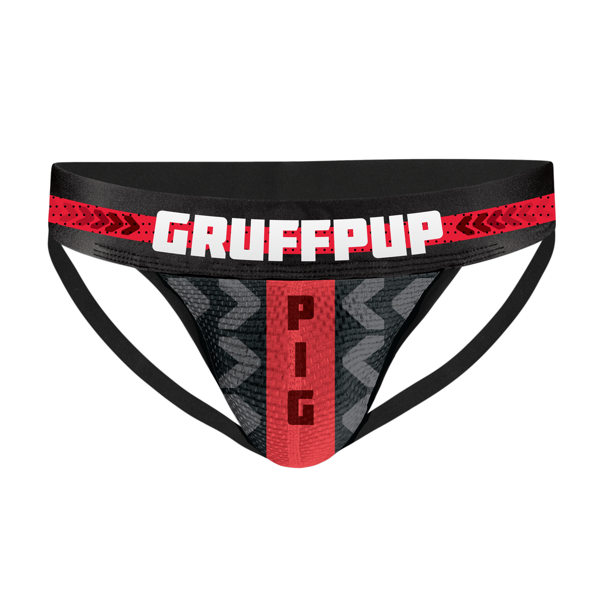 This jock is a Gruff Pup exclusive – designed with “PIG” proudly printed front and center on the pouch. Every detail, from the single-layer mesh pouch to the bold black, red, and white design, screams confidence. This is more than just a jockstrap; it’s a statement piece for any man ready to embrace his playful side. The semi-sheer fabric is designed to turn heads and keep all eyes on you.