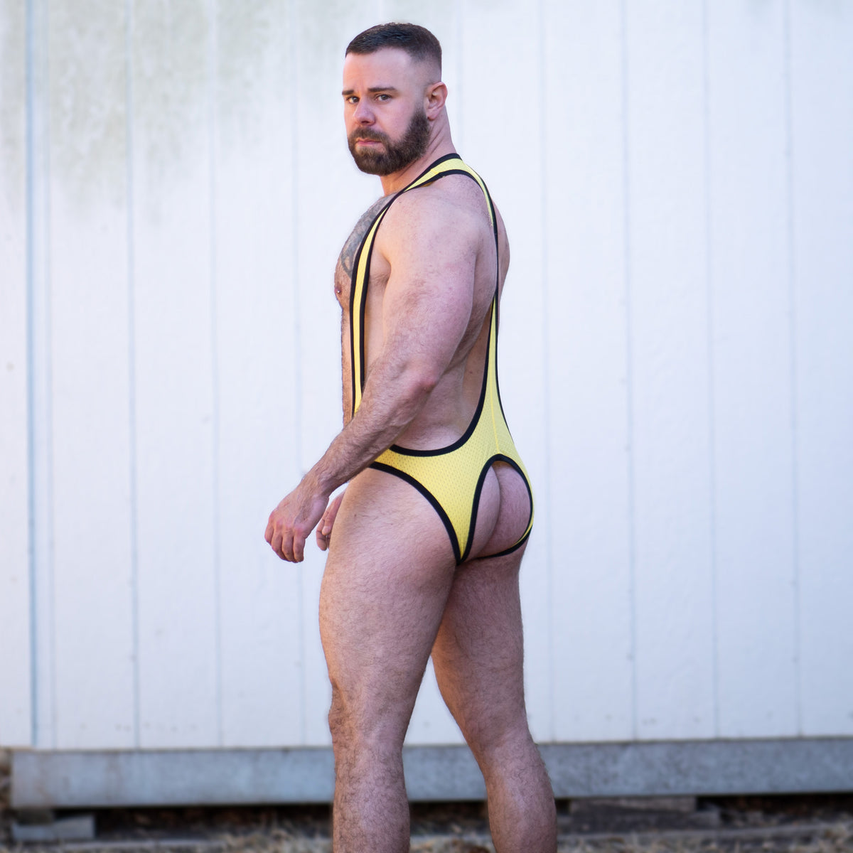 A backless bodysuit men love, featuring a sheer mesh singlet design. Up your singlet game with this sexy mens mesh bodysuit from Gruff Pup, designed for a hot time 🔥. Grab it in Black and Red or Yellow and Black.