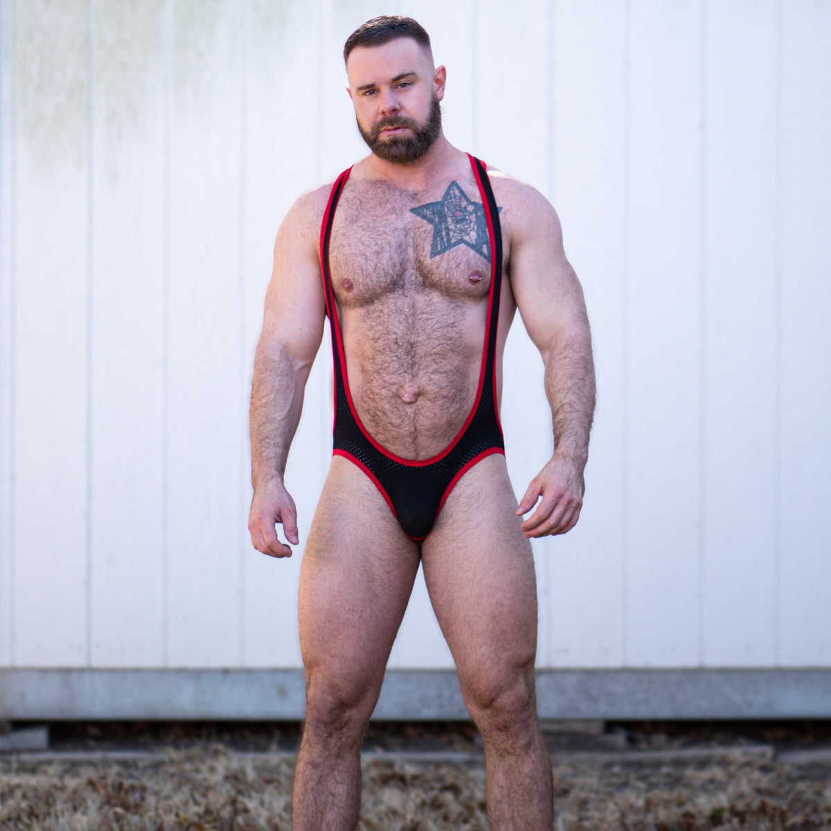Our vision was to create a bodysuit men could wear with confidence and get noticed in. With a bare back, jock cut, and low-cut front, the Mesh Pro Bodysuit Singlet blends sex appeal with a hint of mystique. This sexy wrestling singlet invites a good time, embodying Gruff Pup’s fearless, fun spirit.