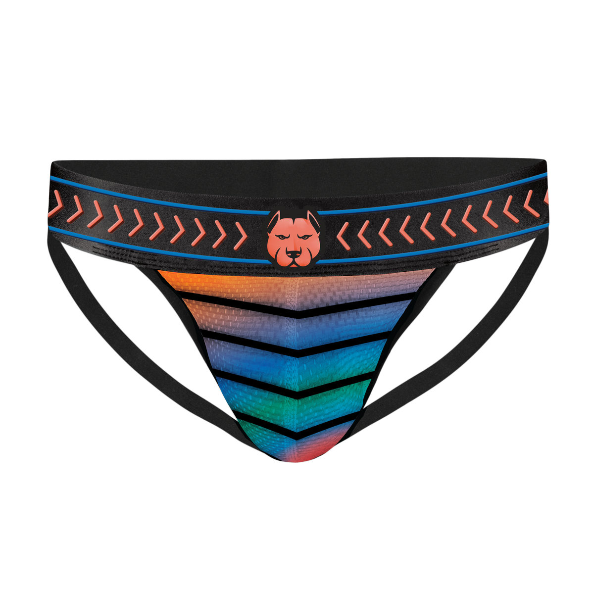 The Prism Jockstrap is a unique, mesh jockstrap featuring Gruff Pup's Pro Mesh fabric pouch, perfect for men seeking mens mesh underwear that shows just the right amount of skin. This rainbow jockstrap has an eye-catching gradient from green to blue to purple to orange, with bold arrow lines pointing down the center of the pouch—designed to draw every gaze exactly where it counts!