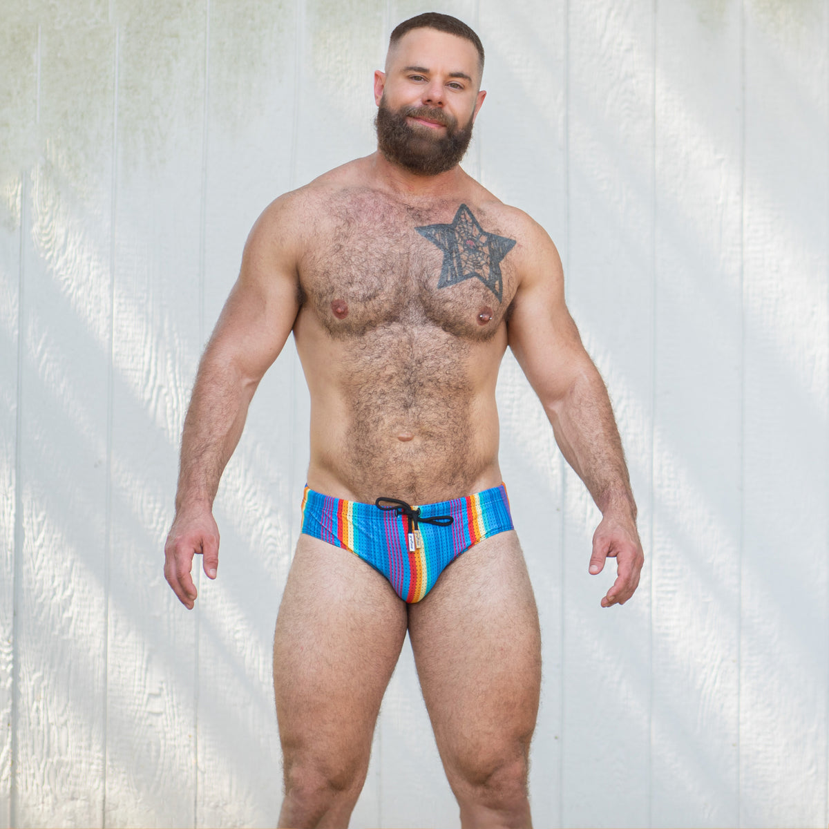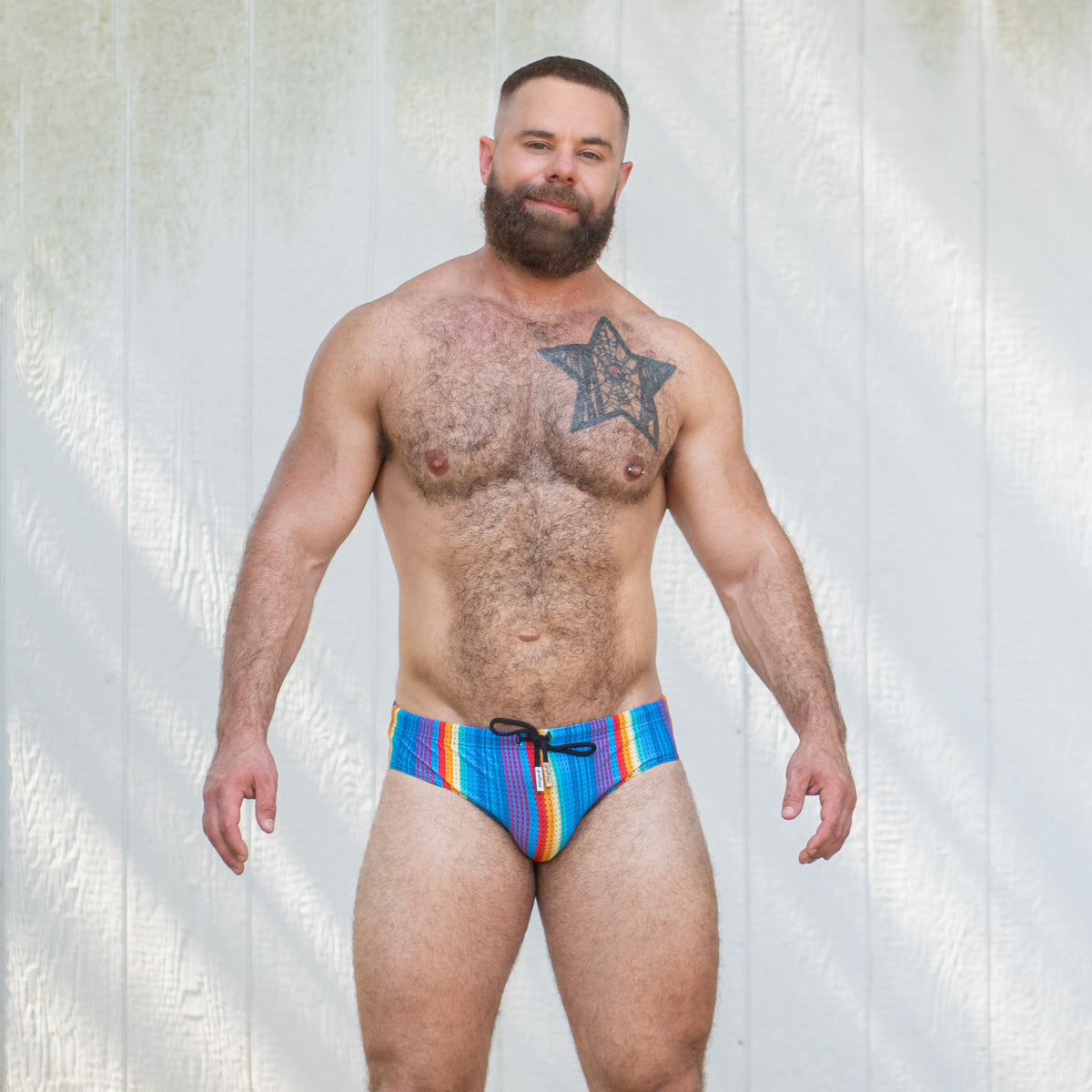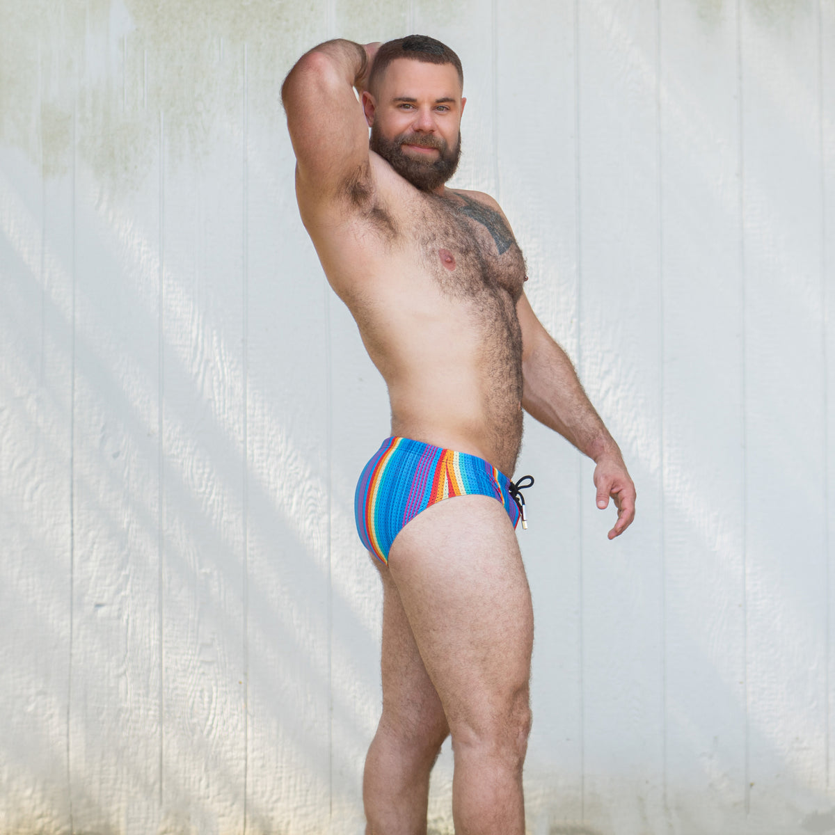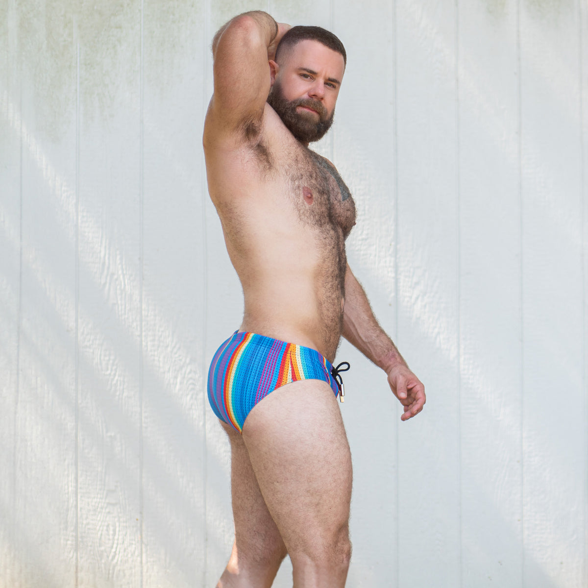 Combine your Rainbow Ripple Swim Brief with one of our Air Tanks to create a seamless, colorful look. Our mesh tanks, available in a range of colors, are the perfect match for this vibrant style. Whether you pick “Woof” or “Pride,” these tanks add an extra touch of flair, making them ideal for both the poolside and the club.