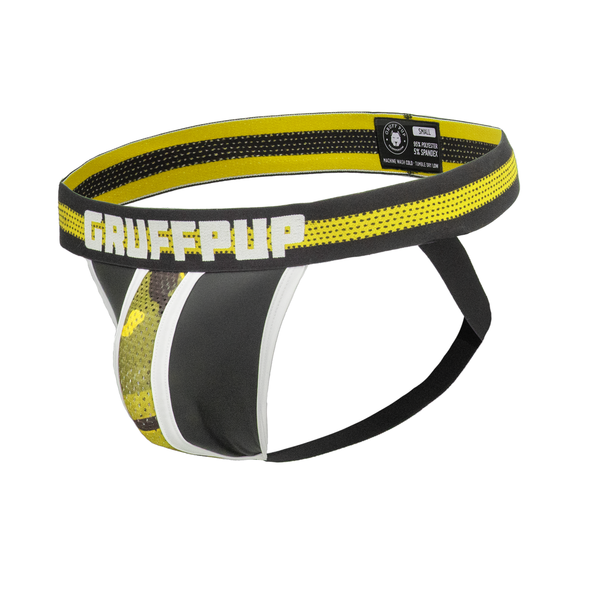 A sexy jockstrap with a camo mesh stripe down the center and leather side panels. It's Masculine, Eye-Catching, and Comfy! Grab a Dominator jock in Red or Yellow. Gruff Pup's fusion of mesh and leather makes this as hot as mens sexy underwear comes! 🥵