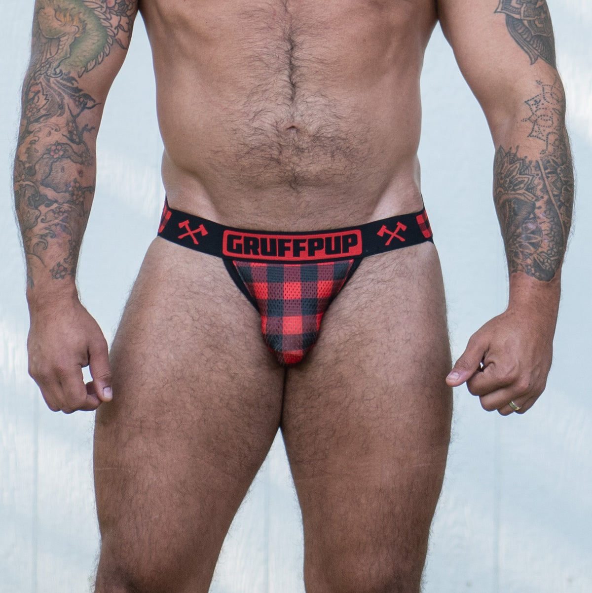 A Plaid Jockstrap for ultra-hot Lumberjack Vibes. One of Gruff Pup's most popular jocks! Black/Red Buffalo Plaid Mesh Pouch - sure to get you noticed and as fun in the bedroom as it is in the locker room. 😉