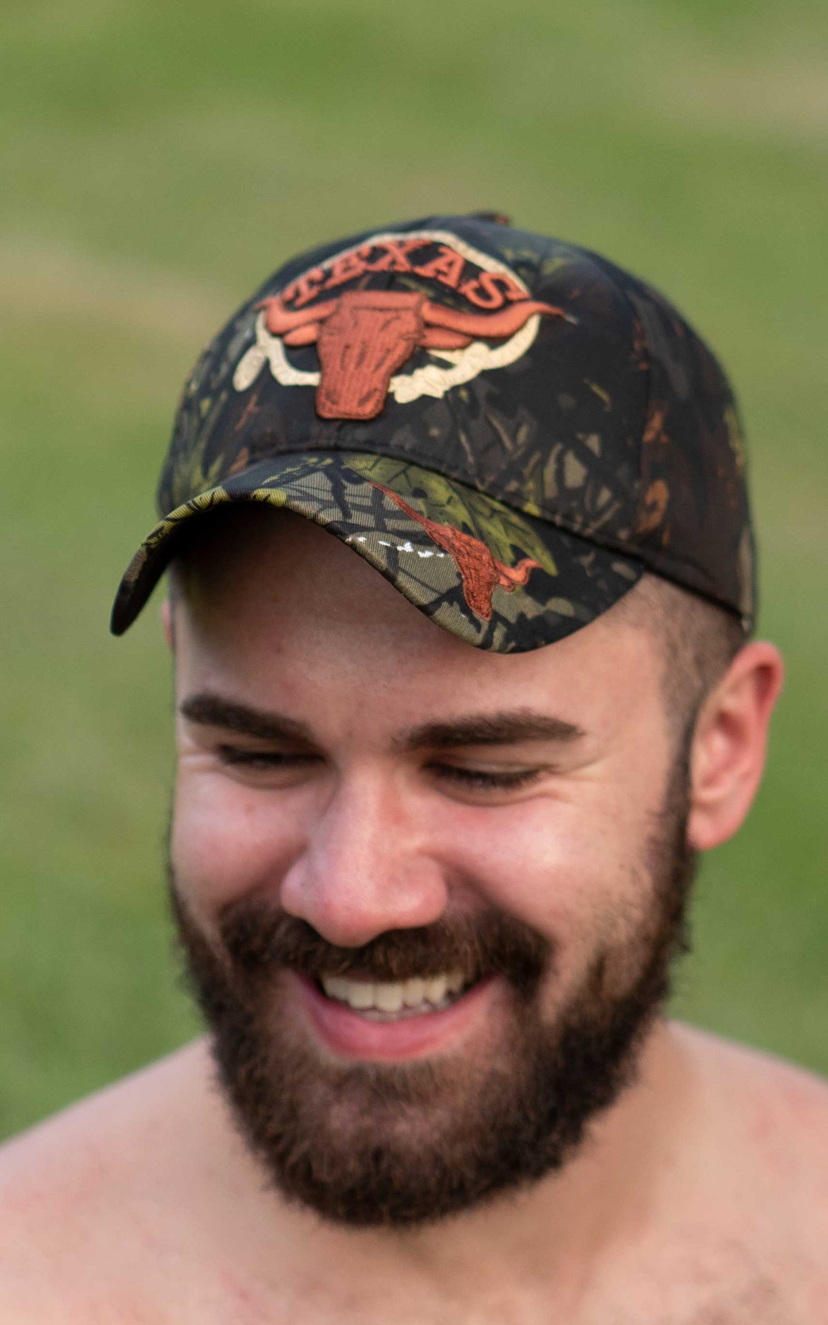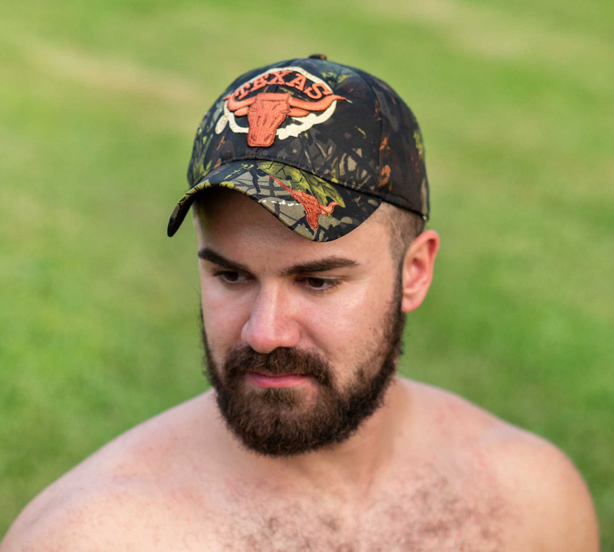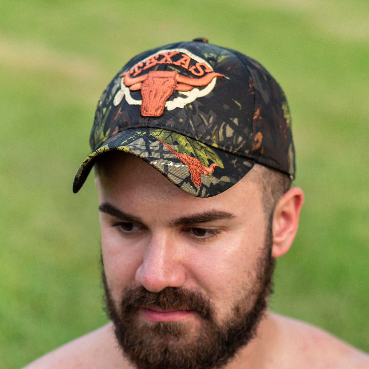 A masculine camo Texas cap designed for men. Butch up your outfit with this sexy cap from Gruff Pup – perfect for showing Texas pride and turning heads. WOOF! 🐂🔥 You'll love the emroidered Texas Longhorn on the front of the hat and the southern camo styling that makes every man look HOT.